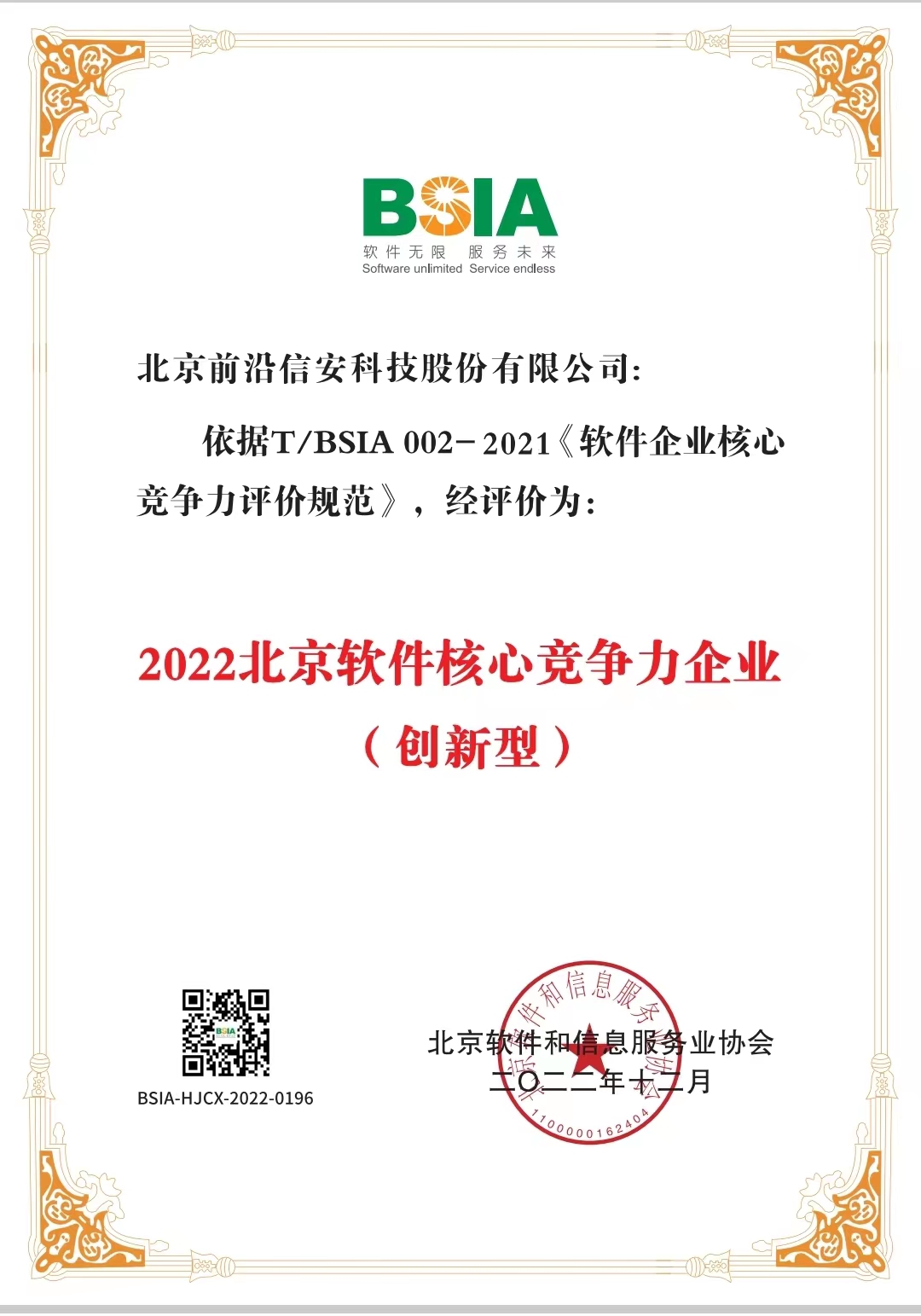 2022年12月,依据T/BSIA 002-2021《软件企业核心竞争力评价规范》九游网页版取得了2022北京软件核心竞争力企业(创新型)认定证书