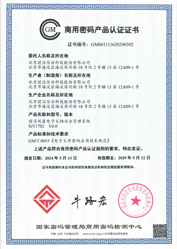近日,九游网页版自研产品成功取得《商用密码产品认证证书》,产品符合GM/T0065-2019《商用密码产品生产和保障能力建设规范》、GM/T0066-2019《商用密码产品生产和保障能力建设实施指南》,顺利通过国家密码管理局安全性审查,取得由国家密码管理局商用密码检测中心颁发的《商用密码产品认证证书》,再次彰显了我公司在信息安全领域的创新实力和技术水平。